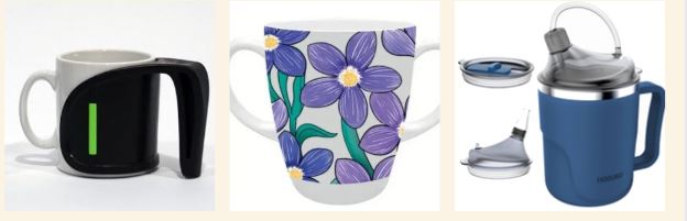 Holding a hot drink securely can be difficult with reduced grip. Two-handled mugs or mug holders: